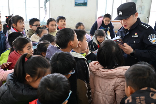 近日,南宁铁路公安局南宁公安处民警深入辖区学校,向学生们讲解铁路安全知识,增强他们的铁路安全意识。图为民警向学生宣讲铁路安全知识。