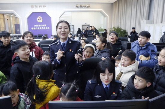 河南省汝阳县公安局近日邀请警察子女参观警营。图为民辅警向孩子们介绍110指挥中心。 本报通讯员 康红军 摄
