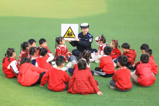 近日,江西省赣州市公安局交警支队章贡大队组织民辅警走进辖区校园,为学生们普及交通安全知识。图为辅警教孩子们识别交通标志。 本报记者 黄辉 本报通讯员 李凡 摄