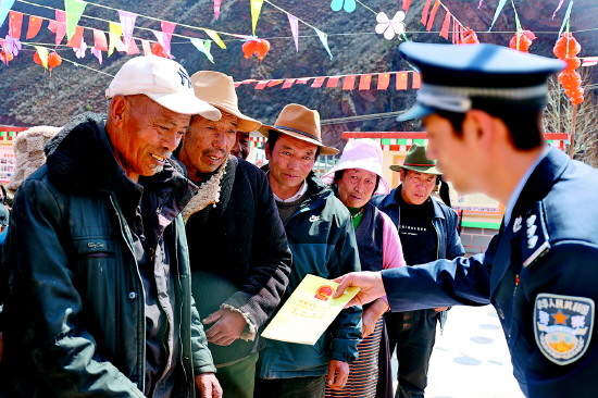 | 图为西藏国安干警向藏区群众宣传国家安全法律法规。
