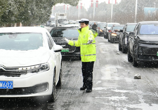 图② 1月20日,安徽省马鞍山市含山县公安局民警在冰雪路面疏导交通,保障群众安全出行。 本报通讯员 冯善军 陈燕 摄
