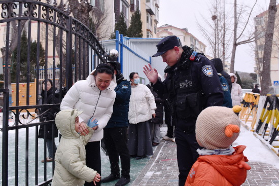图③ 1月19日,山东省烟台市公安局芝罘分局民警冒雪在辖区幼儿园门口执勤,守护孩子们平安放学。 本报通讯员 臧保东 姜鑫 摄