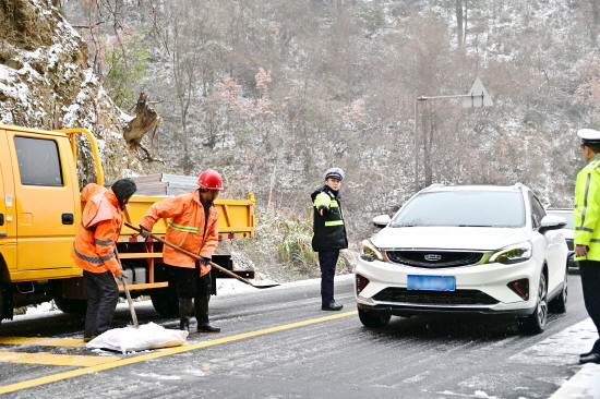 图① 1月20日,江西省武宁县出现雨雪冰冻恶劣天气。武宁县公安局交管大队组织警力深入辖区国、省道临崖临水路段,根据路面结冰和车辆通行情况,在危险路段摆放警示标志,对过往车辆进行交通指挥疏导。图为民辅警在武宁县南皋山路段疏导交通。 本报记者 黄辉 本报通讯员 熊遥 摄