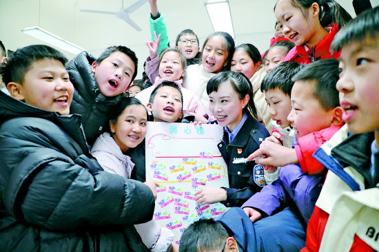 ▲ 连日来,江西省九江市公安局组织民警走进辖区校园,通过展板宣传、有奖问答等形式,向学生普及交通安全知识,开展反诈宣传。图为1月21日,民警在九江小学与学生开展互动游戏。 本报记者 黄辉 本报通讯员 游建栋 摄