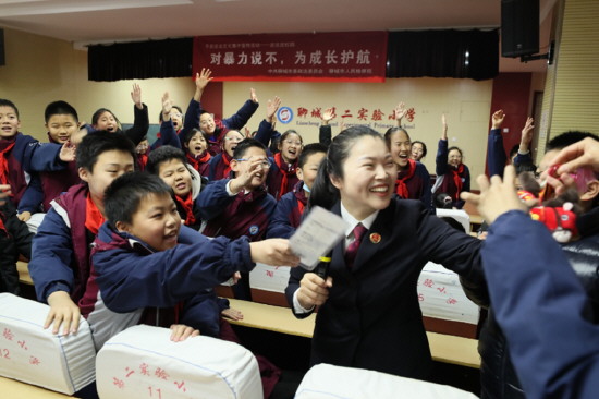 图② 1月21日,山东省聊城市人民检察院组织检察官走进中小学校围绕寒假安全、反电诈、反欺凌等主题开展普法宣传。图为检察官与小学生进行“对暴力说不,为成长护航”知识竞答。 本报记者 李娜 本报通讯员 王凯忠 摄
