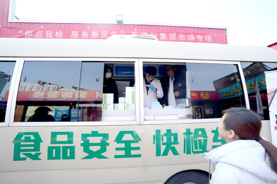 近日,北京市市场监督管理局在全市各区全面启动食品安全“你点我检”活动相关工作,征集市民关注的食品品种与检验项目,推动“点检”模式常态化和全覆盖。图为1月13日,市场监管部门工作人员将食品安全移动快检车开进海淀区五道口集贸市场,开展“你点我检”年货食品安全专场活动。 本报记者 张雪泓 本报通讯员 牟永兴 摄