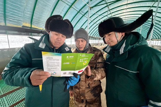 近日,国网奎屯供电公司聚焦辖区养殖企业用电需求,开展“暖冬护航”专项服务活动。图为供电公司工作人员向企业负责人发放宣传手册,讲解安全用电知识。 刘兆新 摄