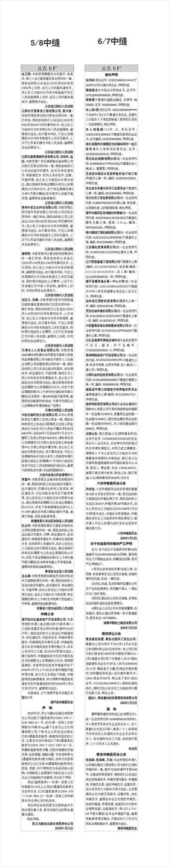 6/7中缝 遗失声明 朱伟林(身份证号:51302319890101****)于2025年10月9日遗失身份证,声明作废。 熊丽丽遗失中级会计职称证书,证书号:31701250932050600568,声明作废。 郑美勇不慎遗失道路运输证,车牌号:闽E99250,证号:350629200943,声明作废。 本人吴*奕(身份证号:44522120020824****)于2026年1月21日不慎遗失身份证,自遗失之日起本人不承担因被他人冒用而引发的一切法律责任,特此声明。 本人刘桂丽(34岁,女,身份证号:522635199212080020)不慎遗失医师执业证书,证书编码:210522700000068,声明作废。 湖北省随州市曾都区何店镇向阳村一组王承华遗失土地承包经营权证,证号:421303102214010110J,声明作废。 君元实业(海南)有限公司(统一社会信用代码:91460000MA5TWMGP3Q)不慎遗失法人章(法人:葛景雯),声明作废。 瓦房店市阎店乡发昌种植农场(个体工商户)遗失公章一枚,编码:210281001026828,声明作废。 东兰县长乐镇长乐村工会委员会不慎遗失公章一枚,编码:4512240004859,声明作废。 东方市农工贸发展有限公司(统一社会信用代码:914690070623021353)原公章、财务章、合同章作废,启用新制印章,特此声明。 南平市建阳区宝鸿建材经营部(统一社会信用代码:92350784MA34GEK25H)不慎遗失圆形光敏公章,规格:3.8cm,编码:35070310013021,声明作废。 喀什德润工程机械有限公司(统一社会信用代码:91653101MA78PB0P8E)不慎遗失公章,编码:6531010046860,声明作废。 三亚德如贸易有限公司(统一社会信用代码:91460203MAD3JP996Q)遗失公章,声明作废。 辽宁凯胜基建工程有限公司不慎遗失公章(编码:211121001028463)、财务章(编码:211121001028464)、法人章(编码:211121001028465)各一枚,声明作废。 镇平县柳泉铺乡第一中心小学(统一社会信用代码:1241132409041605XB)不慎遗失中华人民共和国事业单位法人证书正本,声明作废。 吉林省亿西欧投资有限公司遗失公章一枚,编码:2201041281548,声明作废。 灵宝市诚卓建材有限公司(统一社会信用代码:91411282MACK2K5G5M)不慎遗失公章一枚,编码:4112823001187,声明作废。 兴安盟易采综合采购服务有限公司(统一社会信用代码:91152201MA13PW6Q6B)不慎遗失公章,声明作废。 尖扎县高原华英炮仗碗拌遗失食品经营许可证正、副本,许可证编号:JY26323220010392(1-1),声明作废。 贵州晔园房地产开发有限公司(统一社会信用代码:91520321594180554W)不慎遗失公章、财务专用章、合同专用章、法人章(法人:葛大芬),声明作废。 三明市金利宏经贸有限公司(统一社会信用代码:913504280665963885)不慎遗失铜质公章一枚,编码:3504280001938,声明作废。 疏勒县罕南力克镇诺古特养殖农民专业合作社遗失公章(编码:6531220003741),声明作废。 徐州芮欧商贸有限公司遗失盐城金鹰国际购物中心有限公司开具的装修押金收据原件一张金额为10000元,质量保证金收据一张金额为10000元,固定租金履约保证金收据一张金额为5000元,共三张收据金额为25000元,声明作废。 注销公告:浙江麦迪(义乌)律师事务所(执业许可证号:31330000MD0302954E)经全体合伙人会议决议,决定停办并拟向登记机关申请注销登记。本所已成立清算组,请债权人于本公告发布之日起45日内向清算组申报债权(申报地址:浙江省义乌市福田街道银海路399号国际商务中心18楼,联系人:贾金辉,电话:13958186618),逾期不提出视为放弃。特此公告。浙江麦迪(义乌)律师事务所2026年1月23日 六安仲裁委员会公告 洪传旭:六安仲裁委员会依法受理的窦德俊与你方买卖合同纠纷一案,因无法向你方直接送达仲裁法律文书,现依法向你公告送达(2024)六仲裁字第249号裁决书。自本公告发出之日起经过30日(2026年2月22日)即视为送达。本裁决为终局裁决,仲裁裁决自作出之日起具有终局法律效力。被申请人可在公告期内自行来本会签收仲裁法律文书。 六安仲裁委员会 2026年1月23日 关于伪造我司印章的严正声明 近日,有不法分子伪造我司印章(如伪造编号为4313000166054的合同章),冒用我司名义开展商业活动,涉嫌违法犯罪。我司严正声明如下: 1.我司合法有效的印章(包括公章、合同章、财务章等)已在公安机关备案,其他印章均系伪造、私刻,一概无效。 2.任何以伪造、私刻印章所签署的文件及产生的法律责任,我司概不承认,一律由行为人自行承担。 3.我司已就此向公安机关报案,并将依法追究侵权者的全部法律责任。 4.请社会公众及合作伙伴提高警惕。如有疑问,请务必通过我司唯一官方渠道核实,联系电话:18173869591。 湖南宇顺电力建设有限公司 2026年1月23日 债权转让公告 青岛高校商厦、青岛化院科工贸总公司:根据本公司与李朴于2015年12月23日签订的《债权转让协议》的约定,本公司已将对你们享有的1998年李中银信字第0714-2号《借款合同》项下对借款人共计1笔的贷款债权本金合计(折合人民币)430000.00元(大写:肆拾叁万元整)及相应利息的债权(含附属担保权益),执行案件案号为:(2001)李执字565号,转让给了李朴(身份证号:131102199410060671)。现依法通知你们,请你们自公告发布之日起向李朴履行还款义务。特此公告。 通知人:青岛鲁协投资管理咨询有限公司 2026年1月23日 通 知 横琴德润通技术咨询企业(有限合伙),统一社会信用代码:91440400MA515EPP61,本人林洁芳系该合伙企业的合伙人,本人根据《合伙协议》第八章第二十二条等相关约定在此公告通知合伙企业及全体合伙人:自本通知发出之日起,启动退伙程序,三十日后本人正式退伙。 林洁芳 泰安