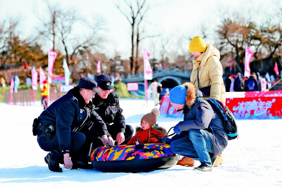▲ 近期,北京什刹海冰场、圆明园冰场等冰雪游乐场所全面开放。北京警方提前部署,加强显性用警与人流疏导,全方位织密防护网。图为1月25日,海淀公安分局民警在圆明园冰场执勤,提醒家长照看好随行儿童。 本报记者 张雪泓 摄