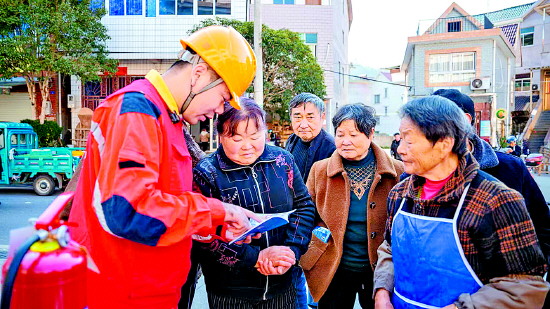 近日,国网衢州供电公司红船共产党员服务队以安全生产治本攻坚三年行动为契机,走进浙江省衢州市常山县辉埠镇,开展电力普法宣传活动。图为服务队队员向群众发放宣传手册,讲解电力设施保护知识。 董瑞恒 摄
