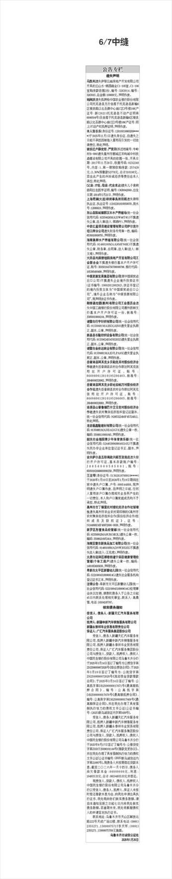 6/7中缝 遗失声明 马凯利遗失伊犁云屾房地产开发有限公司开具的云山水·锦园商业C1-105室、C1-106室购房款收据2份,编号:3263014;编号:3263015,总金额:100000元,声明作废。 杨刚庆遗失抵押给中国农业银行股份有限公司托克逊县支行坐落于托克逊县新编6区银泉路以北圣源中心城C区3号楼108(产证号:新(2021)托克逊县不动产证明第0000504号)及坐落于托克逊县新编6区银泉路以北圣源中心城C区3号楼109(产证号:同上)不动产权抵押证明,声明作废。 本人张长乐(身份证号:12010919860209****)于2025年11月1日遗失身份证,自遗失之日起不承担因被他人冒用而引发的一切法律责任,特此声明。 被拆迁户薛优哲、严奕羽(拆迁档案号:牛岭村B-099)遗失温州市鹿城区双屿城中村改造建设有限公司开具的收据一张,开具日期:2017年11月29日,收据号码:0232248号,内容:1、第一期预收购房款:257420元;2、30%预缴款52778元,合计310198元。若由此产生的纠纷或经济等责任由本人承担,特此声明。 (父亲:才旺,母亲:代吉求占)遗失儿子索南曲阳出生医学证明,编号:O630042060,出生日期:2014年5月21日,声明作废。 上海君澜(大连)律师事务所田雨遗失律师执业证,执业证号:12102201810058078,流水号:12086619,声明作废。 东山县陈城镇郭汉木水产养殖场(统一社会信用代码:92350626MA33W46T6G)不慎遗失公章、法人章(法人:郭燕叶),声明作废。 中资红星项目建设管理有限公司伊尔克什坦口岸分公司遗失财务专用章一枚,编码:6530010009755,声明作废。 海南集群水产养殖有限公司(统一社会信用代码:91460100MAA958FN6K)不慎遗失公章、财务章、合同章、法人章(法人:林文堆),声明作废。 大田县均溪碧桂园房地产开发有限公司工会联合会不慎遗失银行基本户开户许可证,账号:35050164750700000796,银行代码:105395400409,声明作废。 中煤资源发展集团有限公司(原中国煤炭进出口公司)不慎遗失企业境外投资证书(证书编号:1000201200292),该证书登记的境内投资主体为“中国煤炭进出口公司”,境外企业名称为“中煤资源有限公司”,现声明该证书作废。 翱泰温控器(惠州)有限公司工会委员会遗失中国工商银行股份有限公司惠州沥林支行基本户开户许可证一份,核准号:J5950010006104,声明作废。 诸暨市行宇针织有限公司(统一社会信用代码:91330681MA2BDL0250)遗失营业执照正、副本、公章,声明作废。 新昌县长隆纺织设备有限公司(统一社会信用代码:913306245547832032)遗失营业执照正、副本、公章,声明作废。 诸暨市金依达袜业有限公司(统一社会信用代码:91330681MA2D7LPA9X)遗失营业执照正、副本、公章,声明作废。 岳普湖县阿其克乡贝勒克其村股份经济合作社遗失岳普湖县农村合作联社阿其克信用社开户许可证,账号:866060012010105206403,核准号:J8949000328902,声明作废。 岳普湖县阿其克乡欧吐拉帕万村股份经济合作社遗失岳普湖县农村合作联社阿其克信用社开户许可证,账号:866060012010105206665,核准号:J8949000328801,声明作废。 洛浦县山普鲁镇巴什艾日克村股份经济合作社遗失农村集体经济组织登记证副本,统一社会信用代码:N2653224MF45724812,特此声明。 龙岩磊鑫隆建材有限公司(统一社会信用代码:91350881MA33DADG7A)遗失公章一枚,编码:35088110001843,声明作废。 韶关市金福园青少年体育俱乐部(统一社会信用代码:52440200688640216X)不慎遗失民办非企业单位登记证书正、副本,声明作废。 吉木萨尔县五彩湾政兴阁百货商店遗失银行开户许可证,基本存款账户编号:J8856000585801,账号:65050162668600000258,声明作废。 王亚琴(身份证号:51302819700910****)于2026年1月10日至2026年1月19日期间在家中遗失户口簿,户号:000544888,现声明遗失户口簿作废,自声明之日起,任何人冒用该户口簿办理相关业务所产生的一切责任,本人和户口簿家庭成员均不予承担,特此声明。 高州市古丁镇里坑村楼坑经济合作社邹增生遗失高州市农业农村局印制的《高州市农村集体经济组织合作(股份经济合作)组织成员及股权证》,证号:N1440981MF48872996-0038,声明作废。 新罗区彤萱食品经营部(统一社会信用代码:92350802MA8UBC6K3L)遗失公章一枚,编码:35080210072414,声明作废。 海南豆壹农副食品加工有限公司(统一社会信用代码:91460108MADNWJ0X8X)不慎遗失法人章(法人:王克虎),声明作废。 太原市迎泽区柳巷街道宁采臣健康管理经营部(个体工商户)遗失公章一枚,编码:1401053695838,声明作废。 阜新市太平区新蕾幼儿园(统一社会信用代码:52210904318990614G)遗失社会服务机构登记证书正本,声明作废。 注销公告:阜新市太平区新蕾幼儿园(统一社会信用代码:52210904318990614G)经理事会决议注销,请债权债务人于公告之日起45日内联系处理相关事宜。联系人:高晨雪,电话:18104187707。 核实债务通知 受信人、债务人:新疆天汇汽车服务有限公司 抵押人:新疆申新汽车销售服务有限公司 新疆永泰祥车业贸易有限责任公司 保证人:广汇汽车服务集团股份公司 受信人、债务人新疆天汇汽车服务有限公司、抵押人新疆申新汽车销售服务有限公司、抵押人新疆永泰祥车业贸易有限责任公司、保证人广汇汽车服务集团股份公司与授信人、贷款人、抵押权人、债权人中国民生银行股份有限公司乌鲁木齐分行于2025年3月14日签订了编号为公授信字第ZH2500000072020号《综合授信合同》;于2025年3月19日签订了编号为:公流贷字第ZH2500000072020号《流动资金贷款借款合同》;于2025年3月1