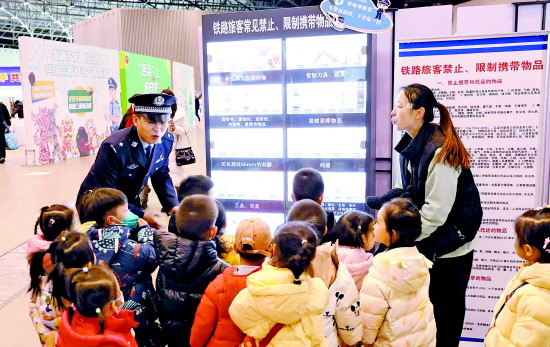 ▲ 为进一步提高广大群众铁路安全意识,构建平安、和谐、畅通铁路运输环境,太原铁路公安处近日在晋阳湖国际会展中心举办“铁路警营开放日”活动。图为民警在安检体验区向参加活动的小朋友讲解乘坐火车安全知识。 本报通讯员 孙刚 摄