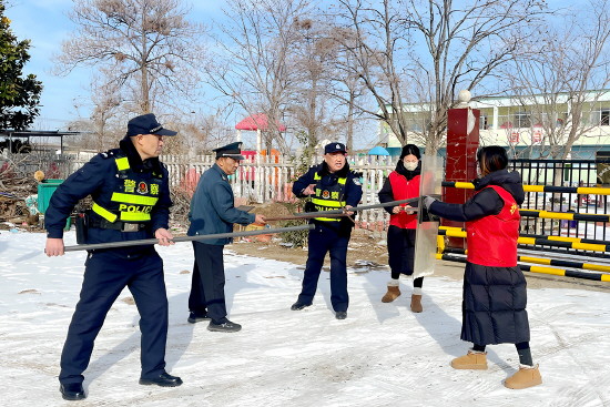 图② 山东省枣庄市公安局山亭分局水泉派出所民辅警近日深入辖区校园,组织开展最小作战单元实战化演练,提升校园安全防范水平。图为民辅警现场示范防护装备使用。 本报通讯员 张雷 摄