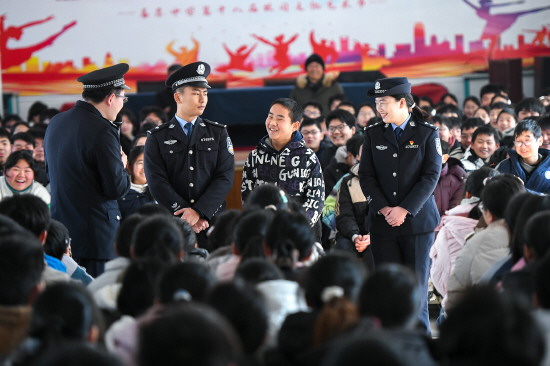 图① 1月26日,安徽省和县公安局民警走进善厚中学,开展“拒绝校园欺凌”主题宣传,通过案例解析、现场互动等方式,提升学生法治意识和自我保护意识。图为民警与学生进行互动问答。 本报通讯员 秦祖泉 摄