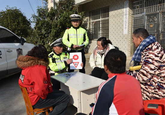 近日,安徽省宿松县公安局交通管理大队民警深入105国道公路沿线村庄,利用农闲时机宣讲冬季交通安全知识。图为民警通过图板教村民识记交通标志。 本报通讯员 李政平 摄