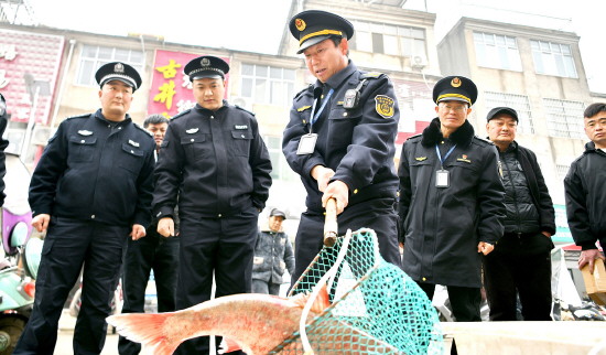春节临近,安徽省阜南县农业农村局联合公安局、市场监督管理局等部门对辖区农贸市场、超市和餐饮单位开展原料采购溯源、生产加工流程和淮河禁捕鱼类监督检查,守护群众节日“舌尖上的安全”。图为1月27日,联合执法人员在曹集镇一家超市进行检查。