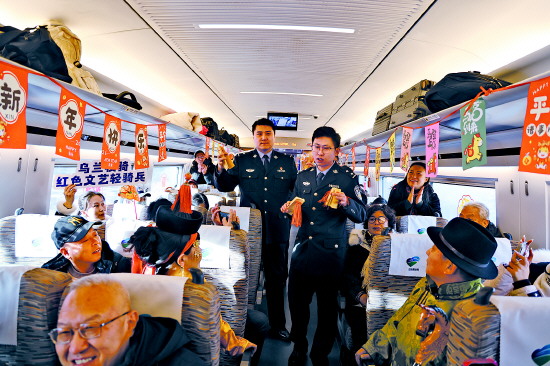 近日,呼和浩特铁路公安处乌兰牧骑队员登上高铁列车,开展“平安春运 情暖旅途”主题宣传活动。图为民警通过快板讲解高铁防盗技巧。