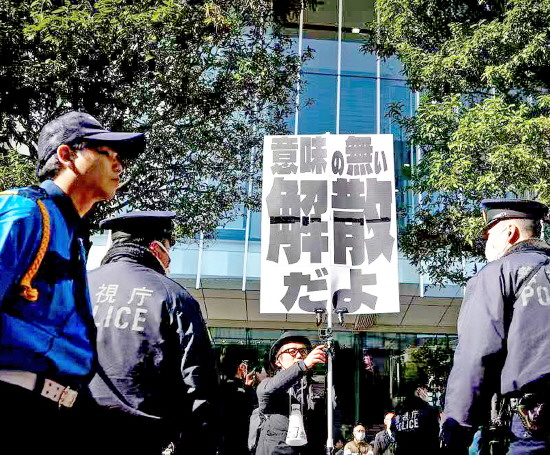 | 图为1月27日,在日本东京秋叶原车站附近举行的日本首相、自民党总裁高市早苗的街头演讲活动中,民众举起抗议标志。