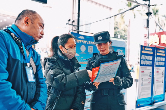 图③ 春运于2月2日正式启动。南宁铁路公安局南宁公安处精心组织系列活动,通过开展法治宣传、提供暖心服务等方式,为春运旅客送上特别的“平安礼”。图为民警向旅客宣传安全出行知识。 本报记者 吴良艺 本报通讯员 范佳苗 张磊 摄