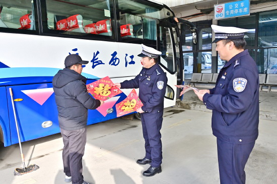 图② 春运首日,江西省武宁县公安局交管大队民辅警在武宁县客运中心以及主要道路,向驾驶人和乘客进行交通安全提醒并赠送春运平安福贴。图为2月2日,民警向客运中心司机赠送春运福贴。 本报记者 黄辉 本报通讯员 熊遥 摄