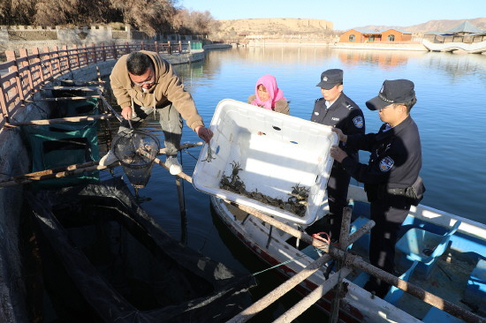 近日,甘肃省定西市公安局安定分局鲁家沟派出所组织警力下沉到辖区凤城湖螃蟹养殖基地,开展矛盾纠纷排查化解和反诈宣传工作。图为民辅警协助养殖户开展捕捞作业并宣讲反诈知识。