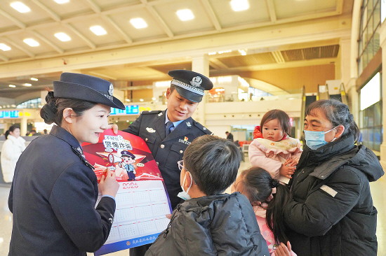 图③ 2月2日,武汉铁路公安处汉口站派出所组织民警在候车室开展“送新年挂历 讲反诈宣传”活动。图为汉口站派出所民警在候车室向乘客宣讲反诈知识。 本报记者 刘欢 本报通讯员 李鹏翔 摄