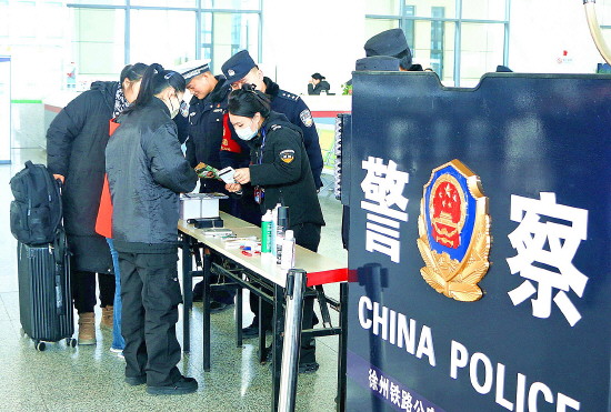 图① 2月2日为春运首日,安徽省砀山县公安局交管大队携手徐州铁路公安处砀山站派出所民警在火车站开展专题安全宣传。图为民警在高铁砀山南站向群众展示铁路旅客限制携带的物品。 本报通讯员 张广星 摄