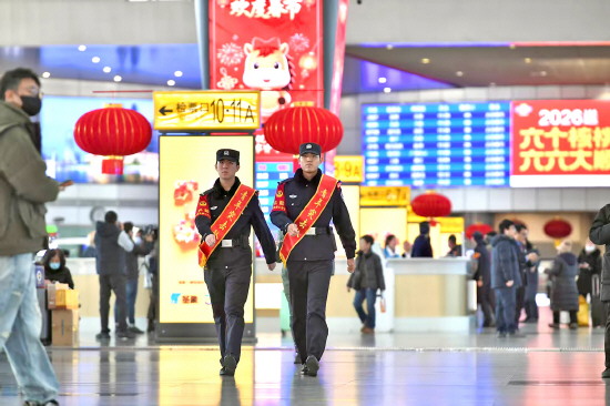 | 2月2日,北京铁路公安局天津公安处开展“平安春运 警民同行 温暖回家路”主题宣传活动。图为铁路民警在车站内开展巡逻。 本报记者 范瑞恒 本报通讯员 魏姮 摄 |