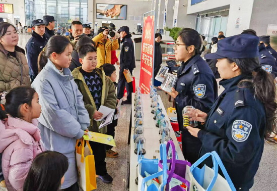 | 2月2日,湖北省咸宁市强制隔离戒毒所联合有关单位在咸宁北站开展“春节回家 平安无毒”主题宣传活动。图为民辅警在候车大厅宣讲禁毒知识。 本报记者 刘欢 本报通讯员 王超 摄 |