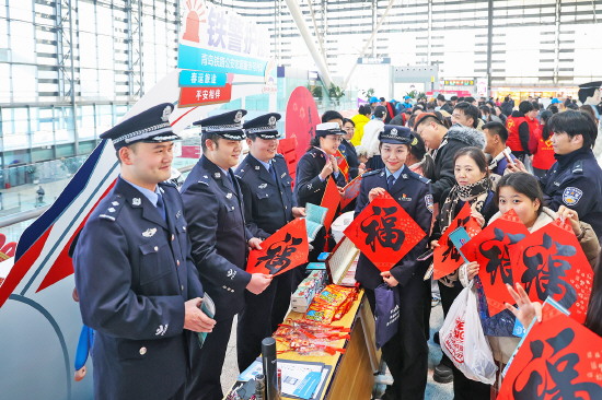 | ▲ 2月2日,济南铁路公安局青岛公安处在青岛北站开展2026年春运“送万福进万家 送文化到一线”文明出行安全宣传活动。图为铁路公安处邀请书法爱好者现场为旅客写福字、对联。