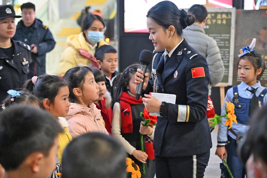 | 2月3日,南宁铁路公安局柳州公安处桂林站派出所在候车室开展铁路安全宣传,通过趣味有奖竞答向旅客普及出行注意事项和安全常识。图为民警向候车的小朋友宣讲安全知识。