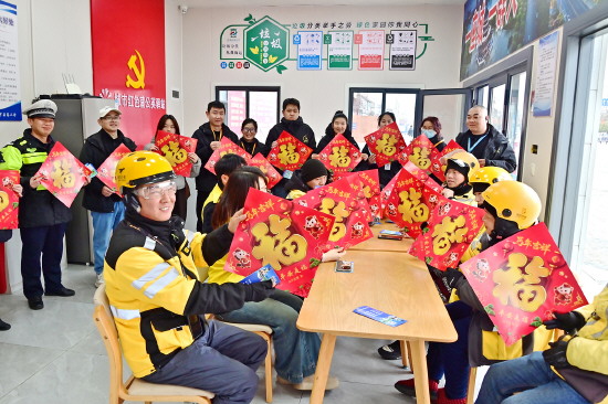 2月4日,江西省武宁县公安局交管大队在武宁县城区开展“春运暖骑”活动,通过赠送平安福帖等方式,为外卖骑手送去春运“安全大礼包”,提醒骑手安全文明出行。图为交警向外卖骑手赠送平安福帖。 本报记者 黄辉 本报通讯员 熊遥 摄