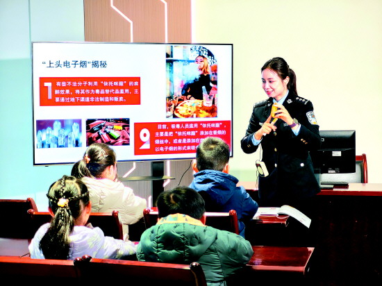 图为莫干山女子强戒所民警方艾为“法治小记者”讲解毒品相关知识。
