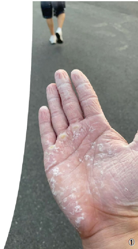 图① 何冬展示自己在工厂务工时手掌上留下的“印记”。