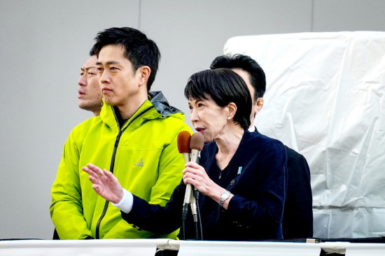 图为1月27日,日本首相、自民党总裁高市早苗(前右)、维新会党首吉村洋文(前左)在东京秋叶原车站附近出席街头演讲活动。