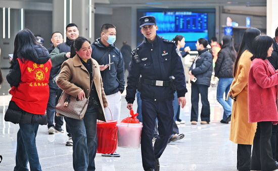 图① 自春运启动以来,位于湖北省宜昌市夷陵区的宜昌北站迎来客流高峰,夷陵区公安分局宜昌北站站前派出所民警积极为游客提供服务,守护群众平安出行。图为近日,民警帮助游客搬运行李。 本报记者 刘欢 本报通讯员 谭江宜 摄