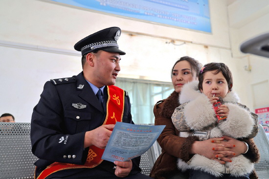 图② 乌鲁木齐铁路公安局喀什公安处英吉沙站派出所民警近日联合车站客运工作人员,紧扣“安全”与“服务”两大主题,在火车站候车室开展普法宣传活动。图为民警向旅客讲解安全知识。 本报记者 潘从武 本报通讯员 陶启乐 曹吉利 摄