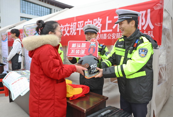 图③ 近日,江西省遂川县公安局交管大队联合多部门在县文化产业中心广场举办“我们的节日·春运”平安交通贺新春活动,民辅警与志愿者通过方言顺口溜、拍手歌等形式,向群众宣讲道路交通安全法律法规。图为活动现场。 本报记者 黄辉 本报通讯员 肖遂冬 摄