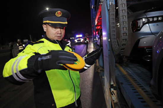 近日,安徽省合肥市交通运输综合行政执法支队联合相关部门在境内高速服务区开展轿运车违法查处“利剑行动”,全力保障春运期间道路安全畅通。图为执法人员对车辆装载数量、外廓尺寸、安全设施配备等情况进行核查。 本报通讯员 汪宜胜 摄