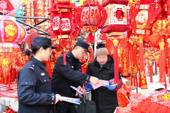 近日,江苏省淮安市公安局洪泽分局组织民警走进辖区农贸市场,开展反诈宣传活动,为新春佳节筑牢反诈安全防线。图为民警向群众普及反诈知识。 本报记者 罗莎莎 本报通讯员 时柏林 摄