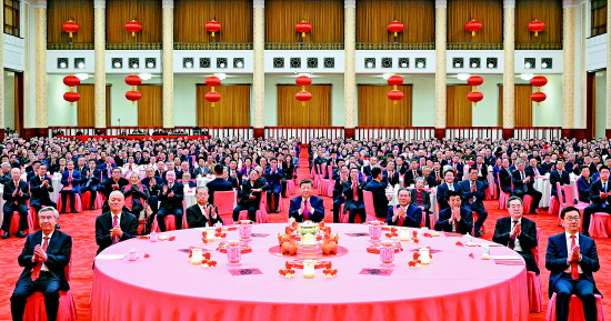 人民大会堂宴会厅灯光璀璨、喜气洋洋,各界人士2000多人欢聚一堂、共迎佳节,现场洋溢着欢乐祥和的节日气氛。