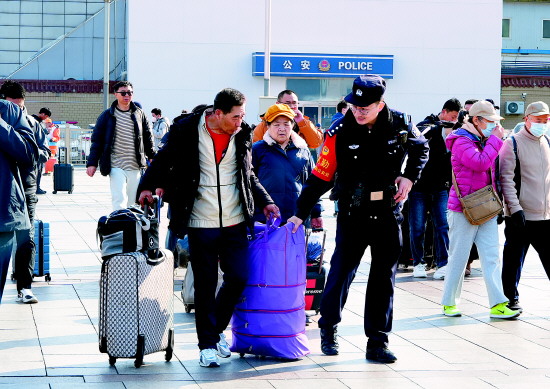 ▲ 春节假期进入尾声。针对返程大客流,北京铁路公安处联动地方公安等,强化站区周边秩序整治和大客流疏导,保障旅客返程平安顺畅。图为北京站派出所民警为旅客提供帮助。