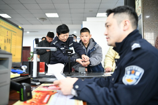 图③ 春节期间,安徽省阜南县公安局交警、特巡警和治安服务窗口民警等坚守一线,守护群众过一个平安春节。图为近日,在阜南县行政服务中心,公安窗口民辅警在为群众办理身份证业务。