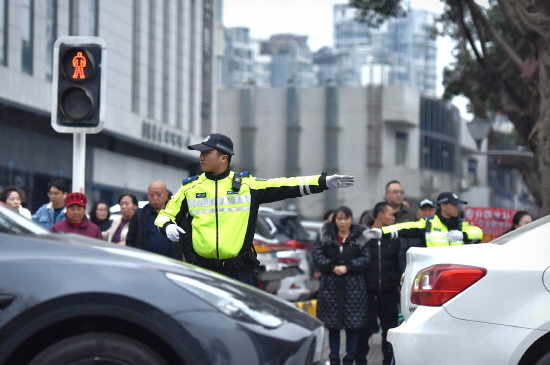 图② 连日来,四川省绵阳市公安局交警支队直属一大队加强辖区民俗活动、商业区域周边交通秩序管控力度,确保节日期间道路安全畅通。图为近日民警在商业街区疏导交通。