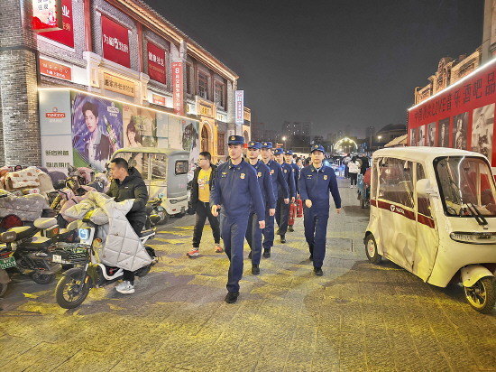 作为站里年龄最大的老班长,张广涛早已将古城的消防水源位置、最佳停车位置、疏散路线等熟记于心。今年的除夕夜,他依旧主动请缨,带领战友前往好南关执勤。人群中,他们一边沿街巡逻排查安全隐患,一边用通俗易懂的语言向过往群众宣讲消防安全知识,用身体力行的坚守为古城守岁。