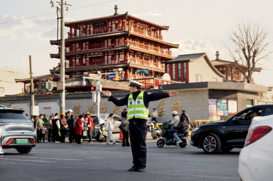 针对春节期间出游高峰,安徽省亳州市公安交警部门加强重点路段管控,通过定点执勤与流动巡逻相结合方式,确保景区周边道路安全有序。图为2月20日,亳州市公安局交管支队交警在谯望楼景区门口疏导交通。 本报通讯员 程家辉 摄