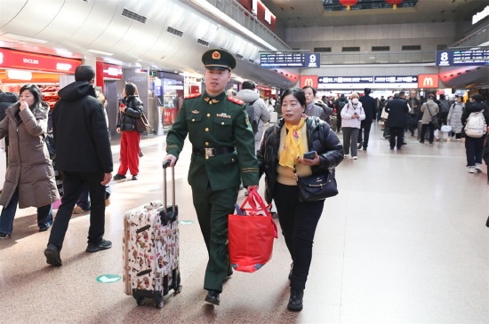 在人员密集的车站进站口、安检区、候车大厅、检票口等关键点位,官兵们始终保持高度警惕,紧盯旅客动态,细致排查各类安全隐患。遇有携带大件行李的旅客、行动不便的老人或身有残疾的特殊旅客,官兵们第一时间主动上前,接过沉重的行囊,耐心引导至候车专区、绿色通道,协调车站工作人员开通“返乡优先通道”,全程帮扶特殊旅客进站乘车。