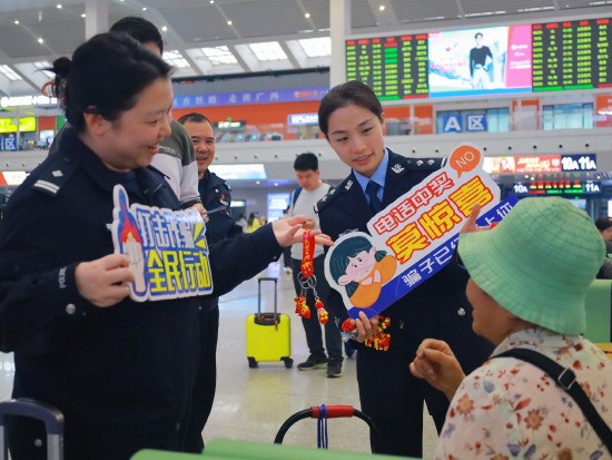 连日来,广西各地迎来春运返程高峰,南宁铁路公安局柳州公安处组建反诈小分队走进柳州站候车室,通过宣讲反诈知识、展示反诈标语、以案释法等方式,向旅客普及防范电信网络诈骗知识。图为民警对旅客开展反诈安全提醒。