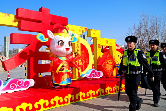 图① 2月16日,新疆维吾尔自治区克拉玛依市公安局白碱滩区分局民辅警在石油文化公园门口巡逻值守。