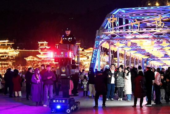 图② 2月15日晚,甘肃省兰州市公安局城关分局第三治安派出所中山桥警务站民辅警在兰州中山桥景点值守。